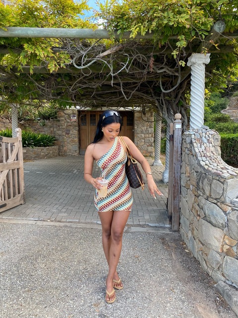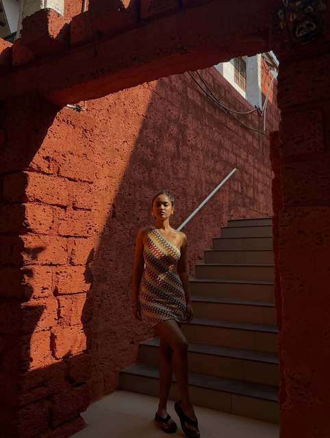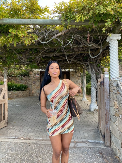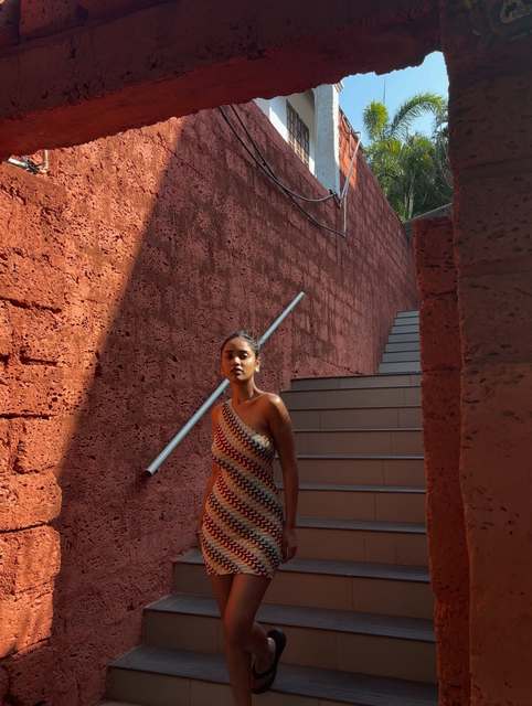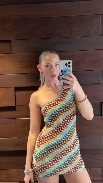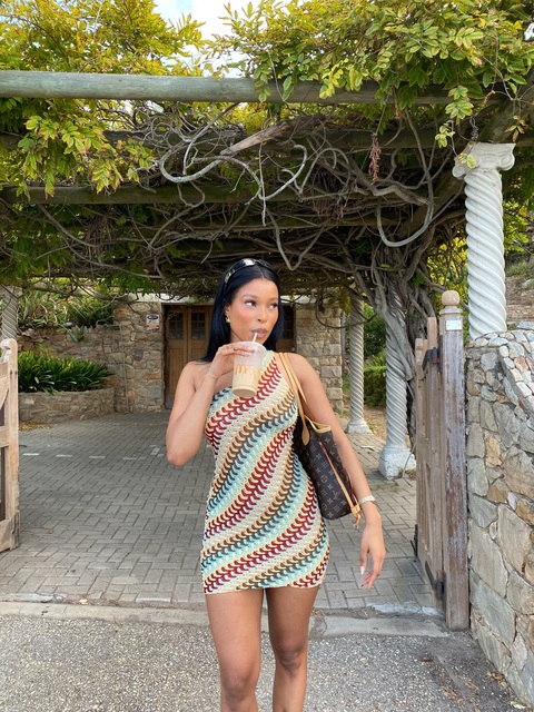 This one-shoulder chevron knit dress is my new vacation essential! The stretchy fabric hugs my body perfectly, and the wavy, warm-toned pattern pops against bright, sunny backdrops like this red wall. I wore it exploring a coastal town and got compliments from locals all day.