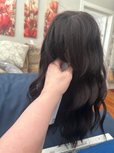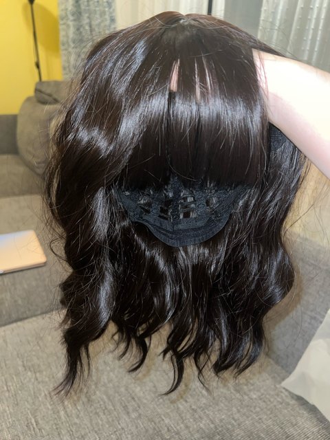 Order arrived before the estimated delivery date – thank you. Very satisfied. Love the wig – the color, soft curls, length and bangs. I colored the white part in the wig black and the band on the back of the wig is too short. The wigs fit comfortably; i have a small head. I use bobby pins to secure the wig in my head. I previously ordered a black one and have ordered a lighter brown one