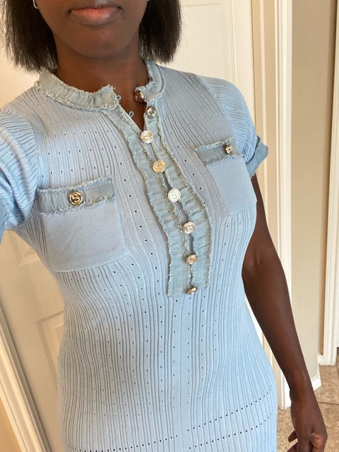 The dress material looks nice and has some weight to it. I am typically us dress size m-l/size 8-10. Just depends on the dress/brand. I ordered l, fits nice and material has some stretch. Only the first 2 buttons are functional. The others do not adjust.