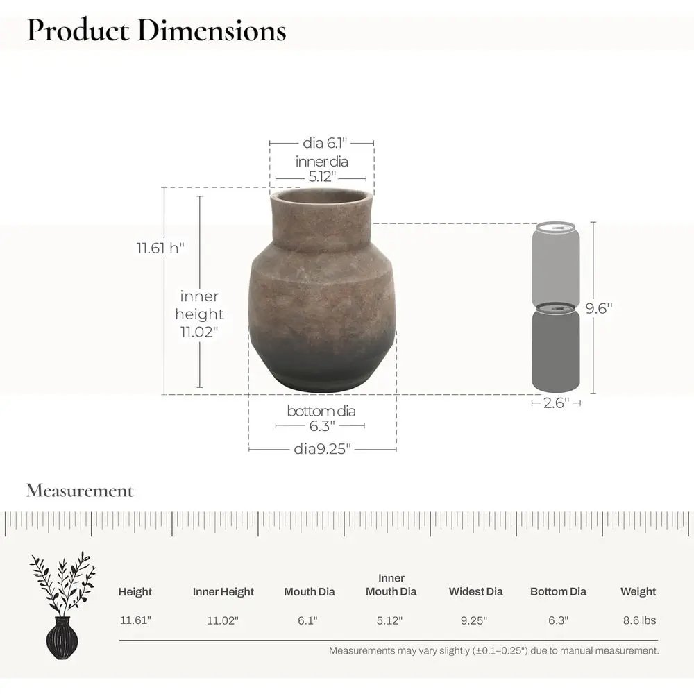 The Rustic Terracotta Gradient Round Vase is a beautifully handcrafted decorative piece designed to bring rustic charm, timeless elegance, and artistic flair to your home. Standing at 11.61 inches tall with a 9.25-inch diameter, this round terracotta vase features a stunning brown ombre gradient that effortlessly complements both vintage and modern décor styles.