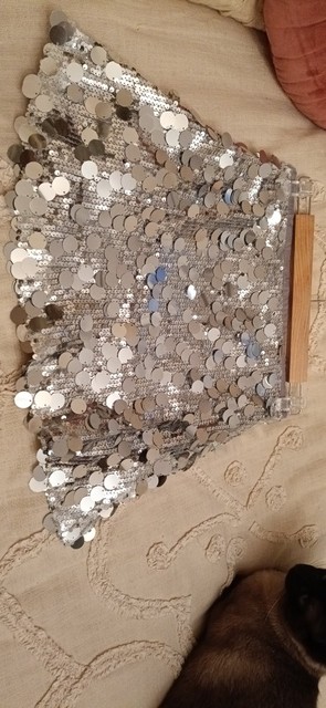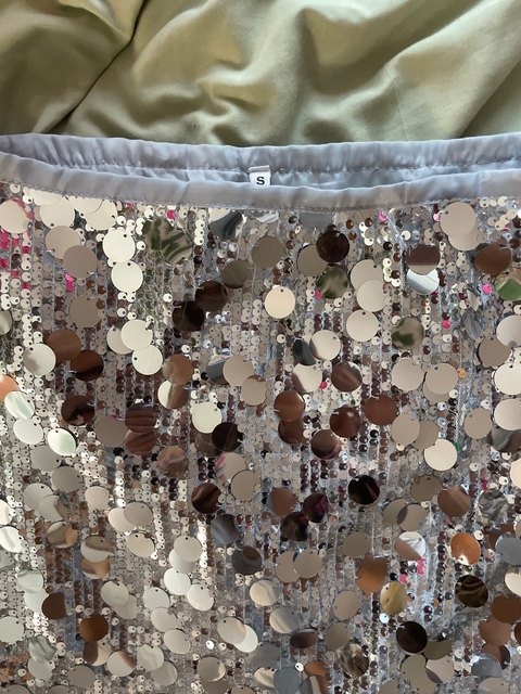 Due to its delicate sequin detailing, the Silver Sequin Mini Skirt requires gentle care. Hand wash only in cold water and lay flat to dry. Do not wring, bleach, or machine wash, as this can damage the sequins. For best results, store the skirt flat or hang it inside out to avoid snagging. Spot cleaning is recommended for minor stains.