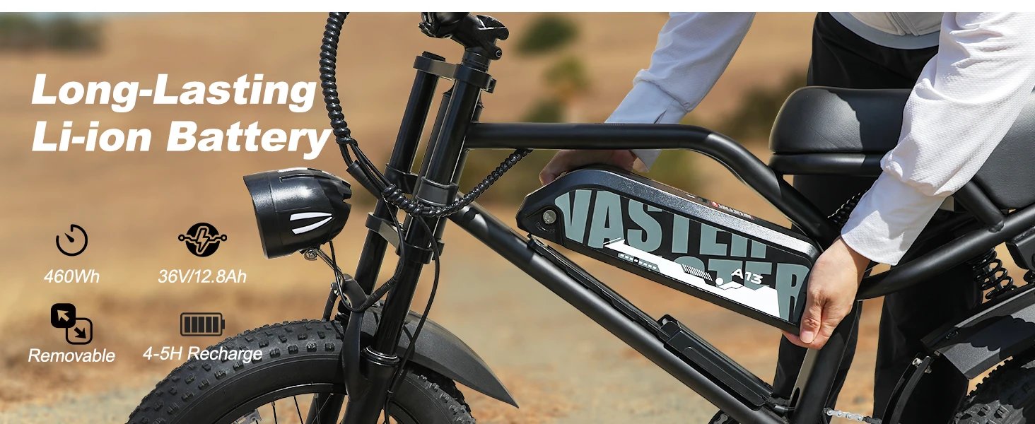 Powered by a 36V 13Ah IPX5 waterproof lithium-ion battery, this e-bike reaches up to 60 miles in pedal-assist modeor 35 miles in full-electric mode per charge (depending on terrain and riding style). The removable, lockable designallows convenient charging at home or the office in just 4–5 hours.