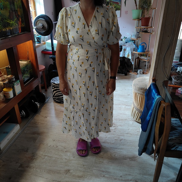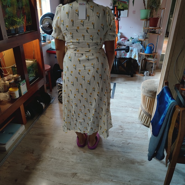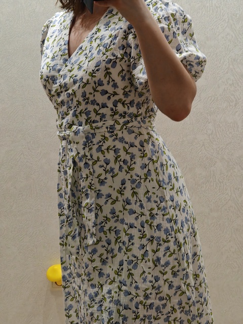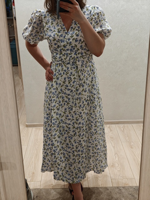 The dress is great. Not sure about muslin, but it feels very pleasant on the body. For hip circumference 98, size L fits. For height 161, it reaches mid-calf.
