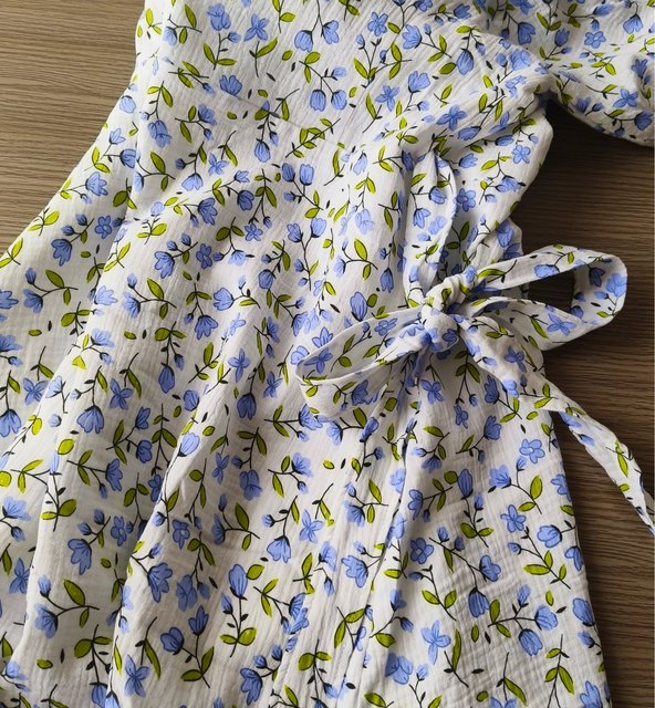 A very cute summer dress, made of soft (well, very soft) wrinkled fabric. Fully matches the description. The main fabric is slightly see-through, but there is a lining, so it’s fine. I am satisfied with the purchase and recommend this dress for buying.